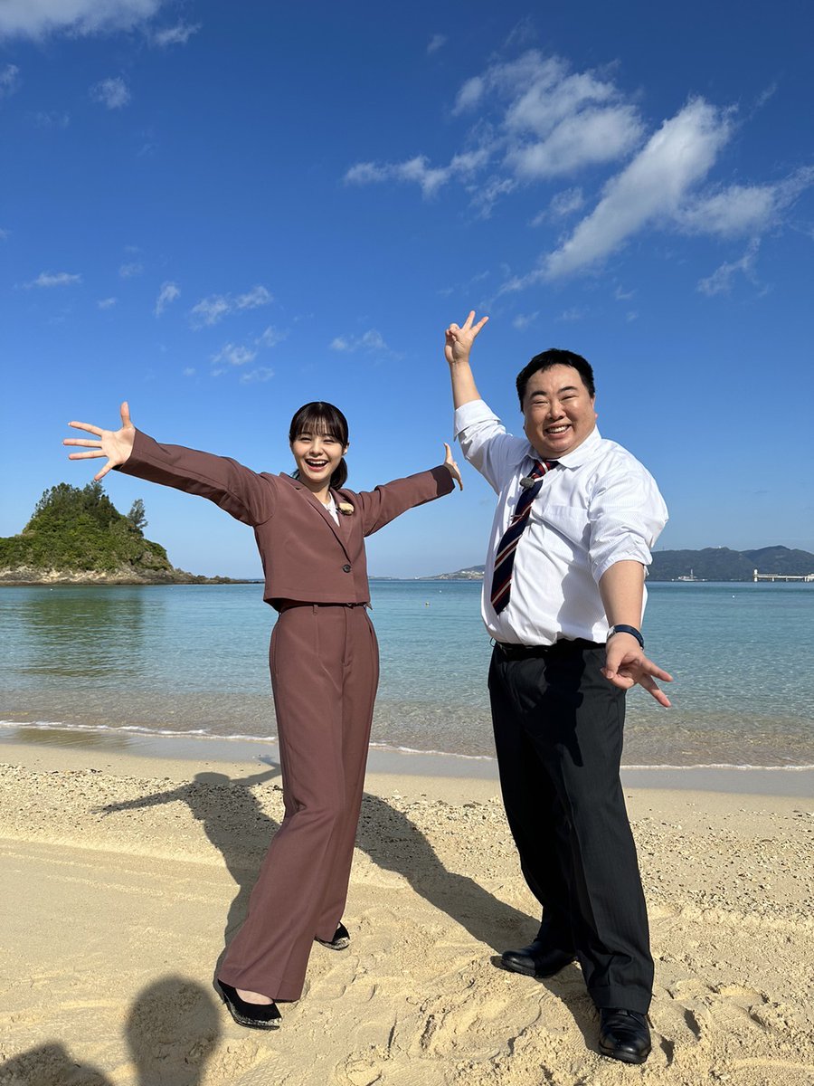 在沖繩海灘前的塚地桑、與實習生的本間桑都有最棒的笑容