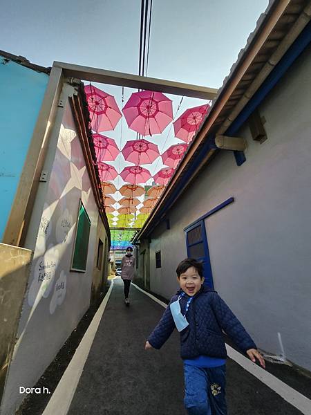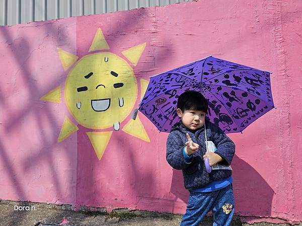 走彩繪牆回去牽車。皮孩真的很愛他的彩繪傘,剛好跟熱死人的太陽公公合照,變成模擬陽傘的功能XD
