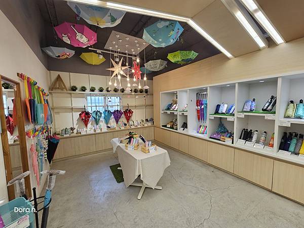 雨具販賣區,有別於一般觀光工廠呈現器物製作的過程再販賣,彩虹屋-卡里善之樹直接呈現各型各色的商品。