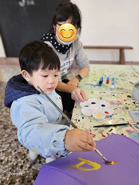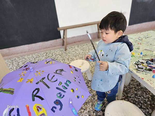 二樓的工作室。可能因為週六早上九點多的關係,觀光客尚未湧現,讓我們不小心包場了。皮孩選了purple底色的兒童傘,被撐開放在專業的傘架上。工作人員提供材料、介紹環境,還有講解繪畫過程,接著就靠皮孩自由發揮了。