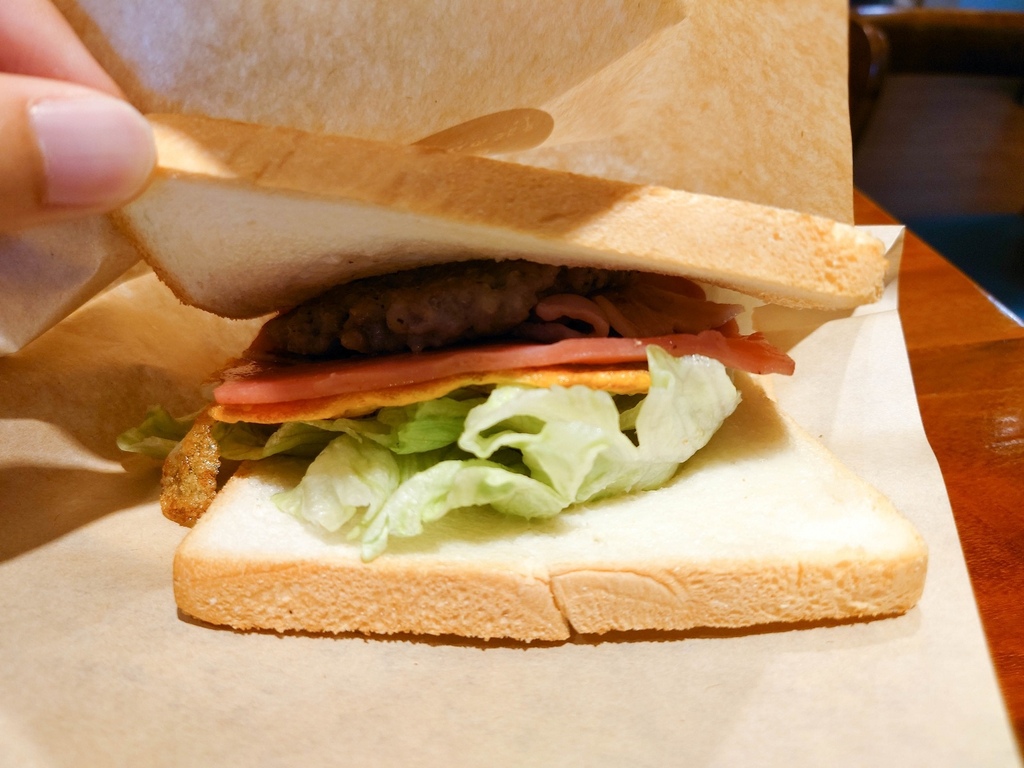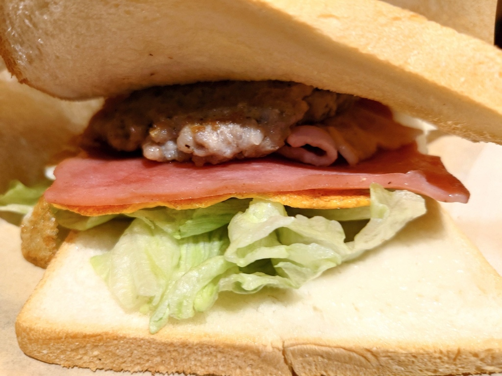 吐司夾著招牌手打豬肉排、煙燻培根、火腿片、太陽蛋和生菜,