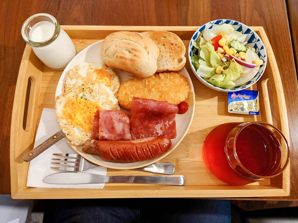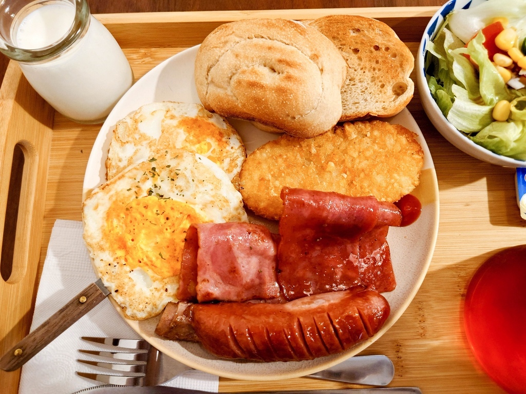 有帶骨香腸、煙燻培根、火腿片、兩個太陽蛋、薯餅、手做麵包、沙拉、紅茶、牛奶