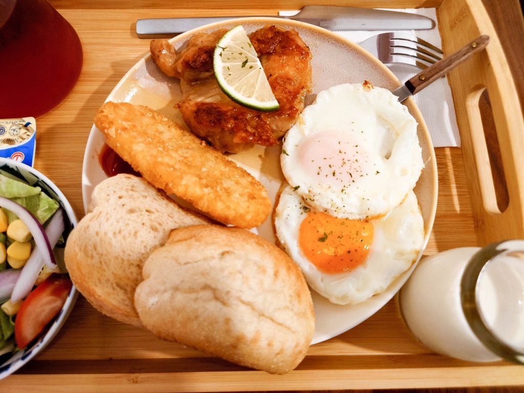 有香煎雞腿排、兩個太陽蛋、薯餅、手做麵包、沙拉、紅茶、牛奶
