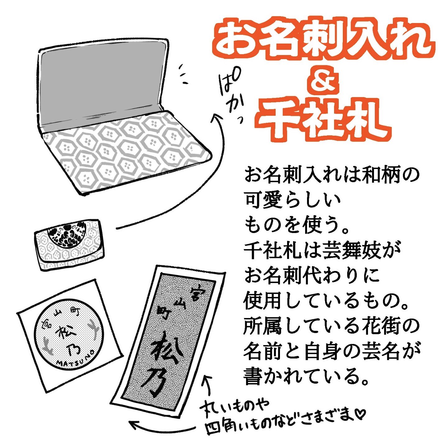 千社札是藝妓舞妓用來代替名片之物,會寫上所屬的花街與自己的藝名,有圓有方