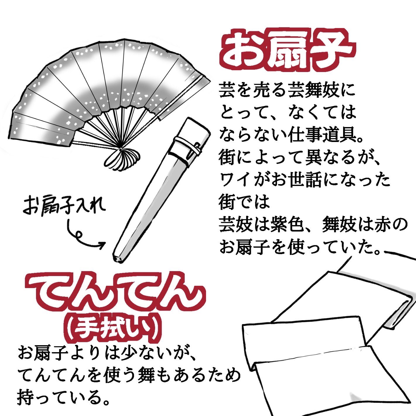 不同花街有不同規矩,在作者工作的地方藝妓持紫扇,舞妓持紅扇