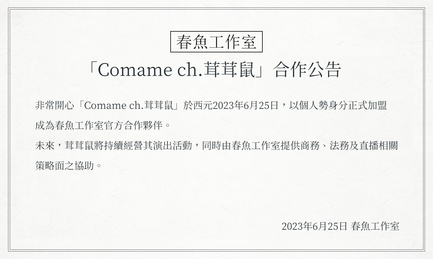 不過還好今天答案揭曉,茸茸鼠是以個人勢的身分加盟成為春魚的合作夥伴!