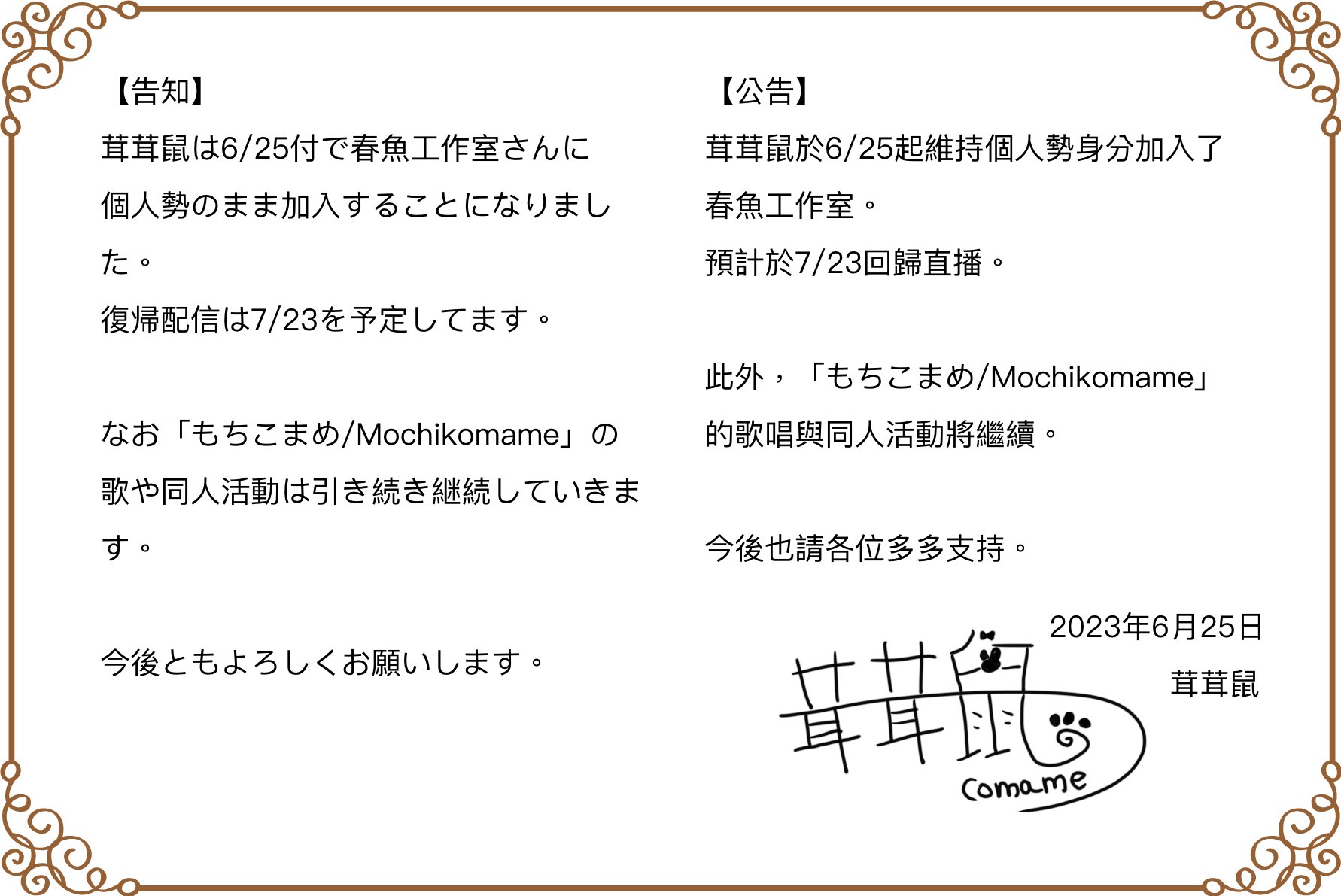 [閒聊]「茸茸鼠」宣布加盟春魚工作室,維持個人「茸茸鼠」宣布加盟春魚工作室,維持個人勢身份 7/23回歸直播! 日本個人勢 VTuber 茸茸鼠(もちこまめ)目前正在冬眠中,但仍然在社群和粉絲互動, 並用中文在日記中分享各式各樣的美食。而今日(25),茸茸鼠宣布將維持個人勢的身分 加入春魚工作室啦!並且預計在 7 月 23 日回歸直播,「もちこまめ Mochikomame」的12