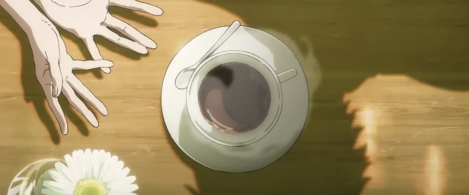 電影有一個改動是咖啡廳的桌子上擺著白色的花,原作是沒有的