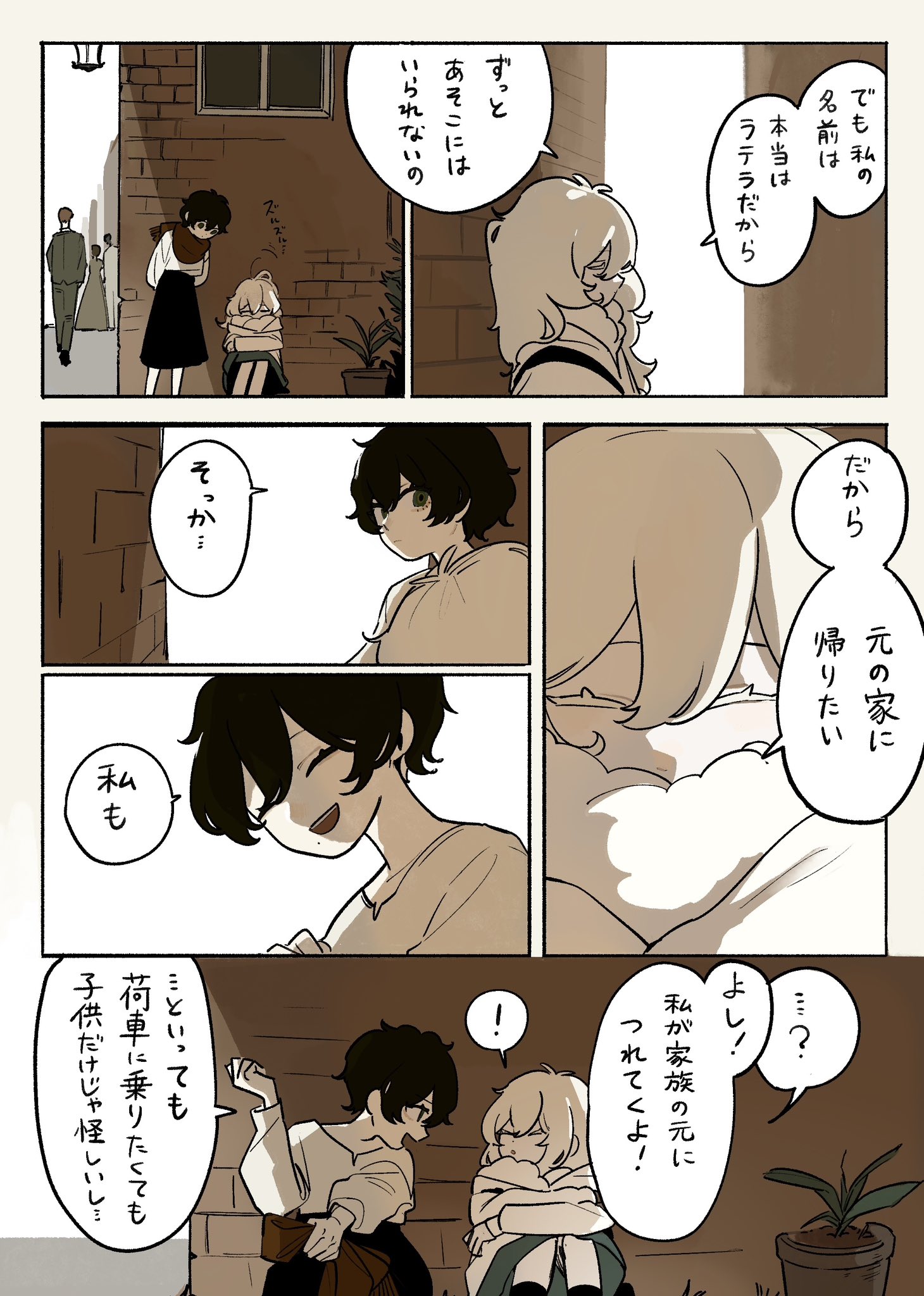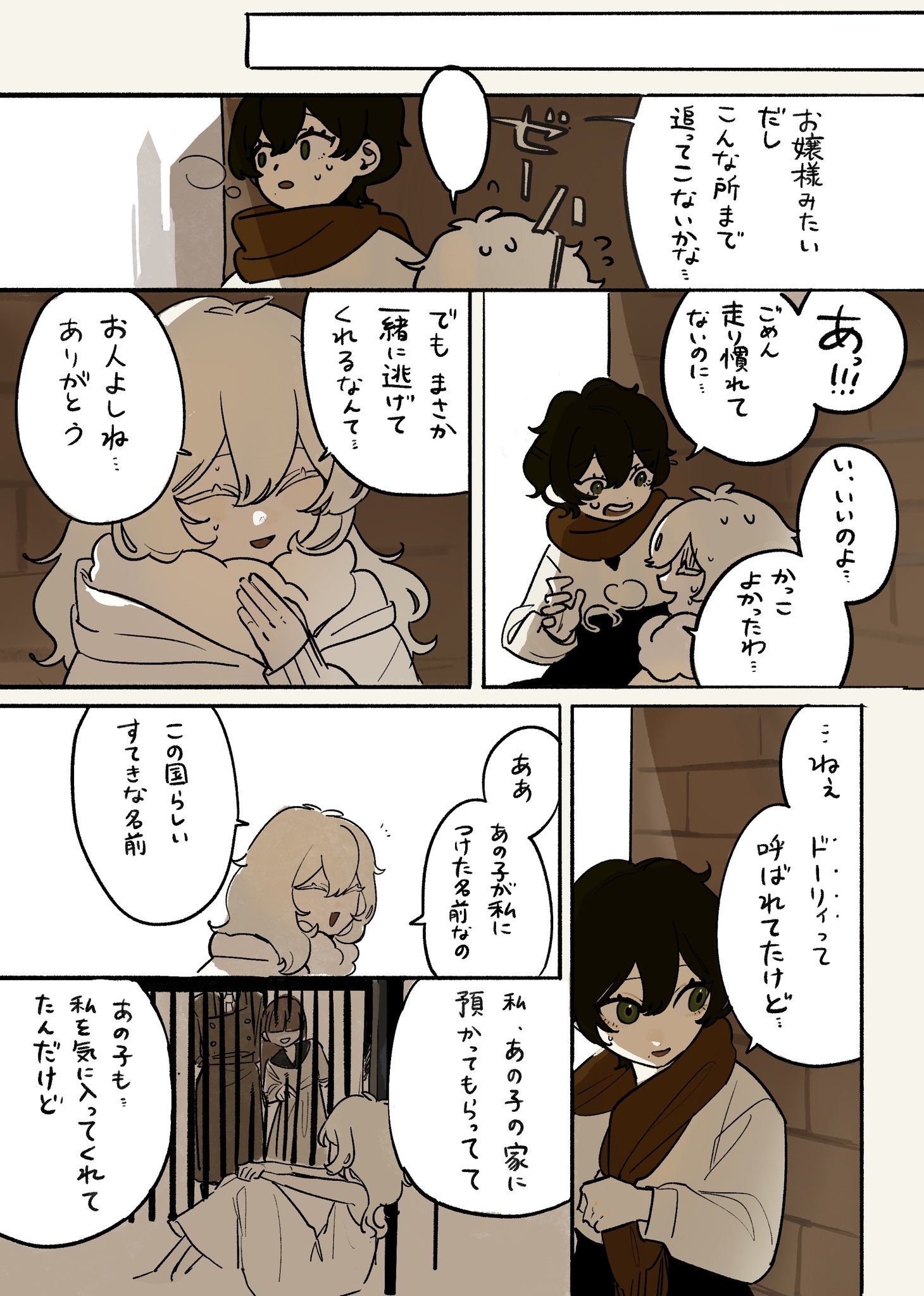 「不過我真沒想到妳會帶著我一起逃跑,真的是個好人呢....謝謝妳」
