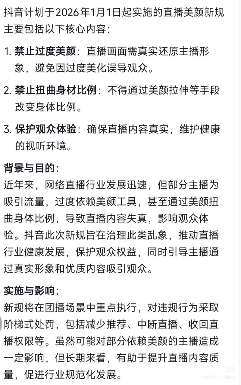 說抖音明年一月一日開始禁止過度使用美顏直撥帶貨