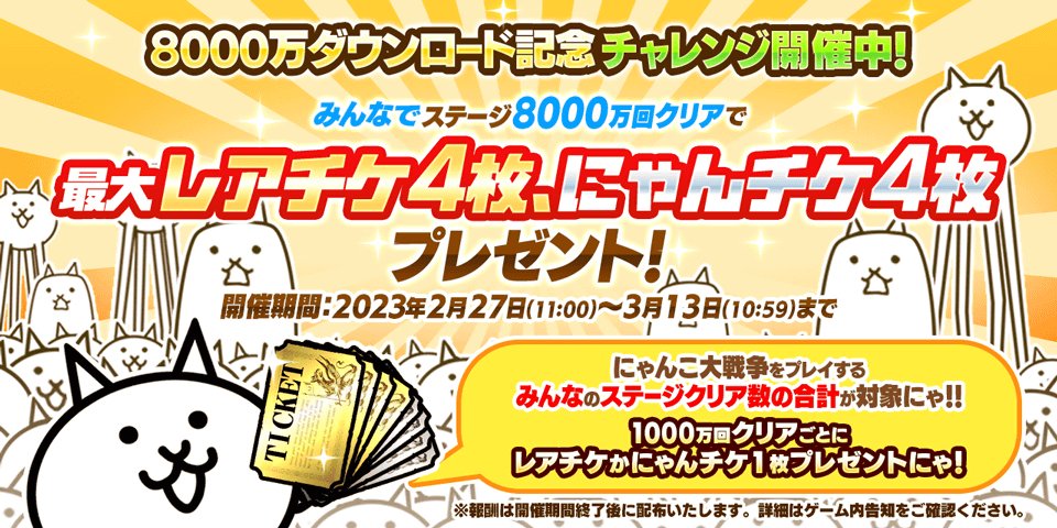 \\ <(*ΦωΦ*)>タッセイ!! //にゃんこ大戦争が世界累計8000万DL達成!超特大感