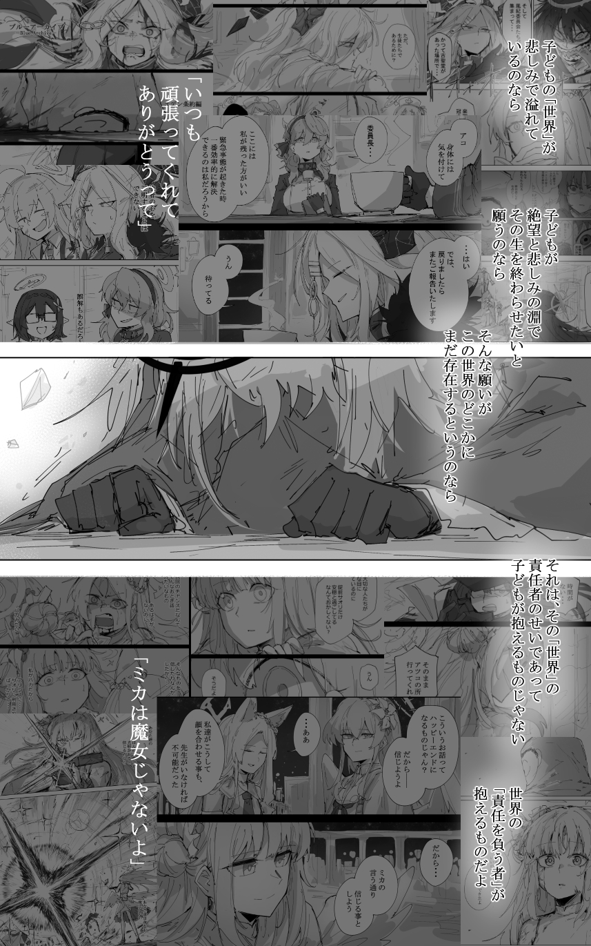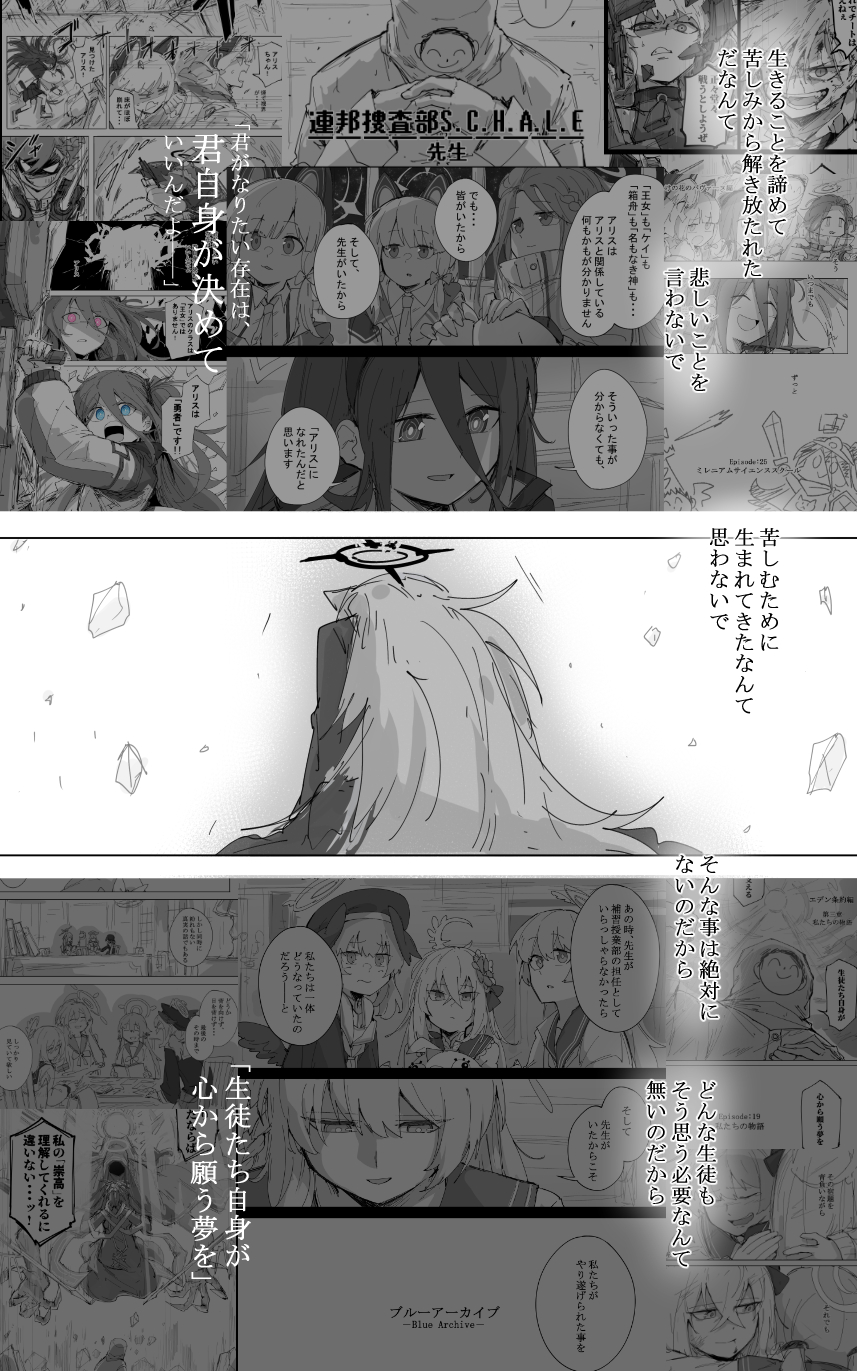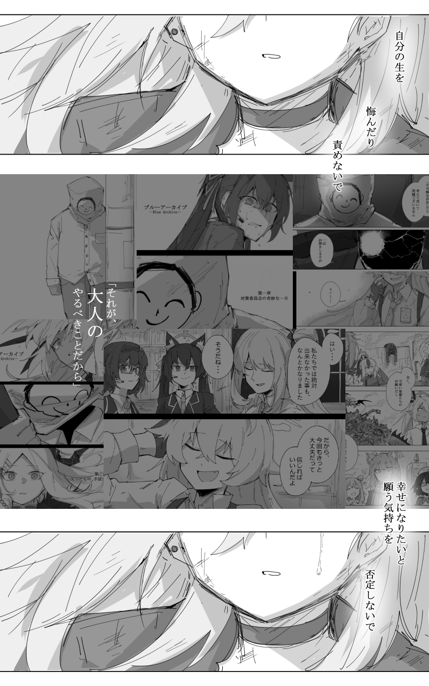 Re: [蔚藍] 終章小感(雷)我是比較感性的玩家,追劇情的時候沒太在乎合理性跟邏輯,以這部作品來說硬要推敲這些的話感覺會很累 (ex學生只有女生?沒有男性她們怎麼會有羞恥心?怎麼產生後代延續族群的?東西常常被打壞怎麼修的?城市的規模相對於人口及經濟活動不成比例的大 最終章的主軸,我覺得是製作組想傳達出「大人有責任盡可能替孩子承擔、替他們打造一個盡可能充滿希望的世界」這樣的理念 主線劇情中的學生們雖然因為擁有光環所以體力超群,但在承擔各式各樣的外在壓力之下,未成熟的心智是脆弱而易崩潰的,所以在主線中的玩家,作為唯一的「老師/大人」,工作就是盡可能的替學生們分擔、解決問題 那麼這樣的分擔,能夠做到什麼程度呢?平行世界的故事,透過把情況推展到極限,給出了答案8