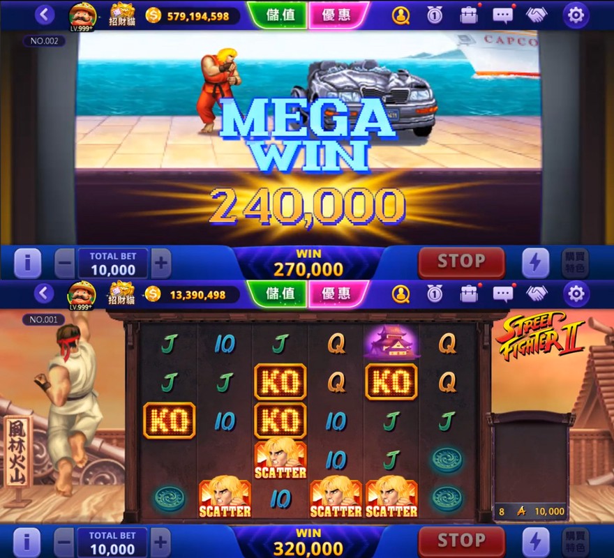 (上) 隆 / 肯連續出 3 次「旋風腿」後,該局必定開出 MEGA WIN 大獎。(下) 隆 / 肯連續出 3 次「昇龍拳」後,該局必定開出 SUPER WIN 大獎。