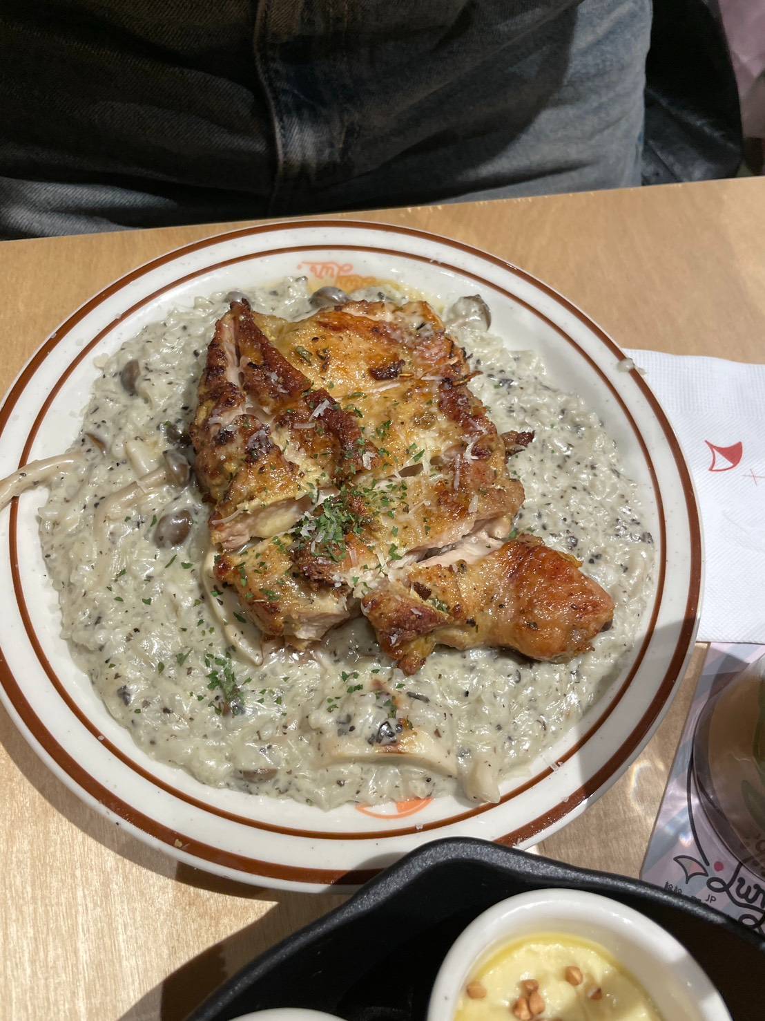 松露野菇烤雞腿燉飯:一樣菇類和雞腿都給的很大方 調味上也沒什麼問題