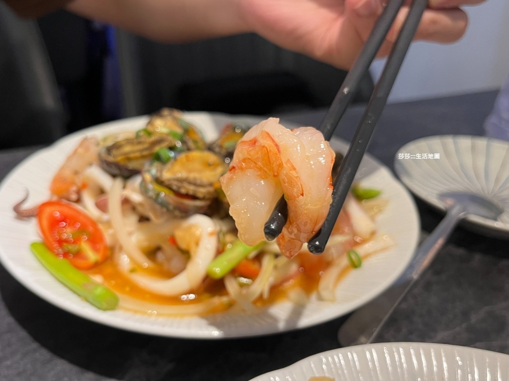 清爽的佐料再放上魷魚、草蝦仁還有鮑魚,