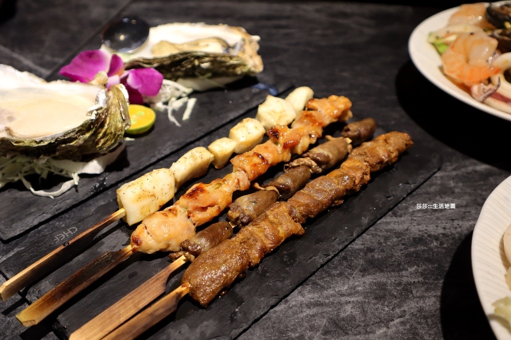 由右至左分別是孜然羊肉串 ($60)、原味雞心 ($60)、醬香膝軟骨 ($60)、花枝干貝燒