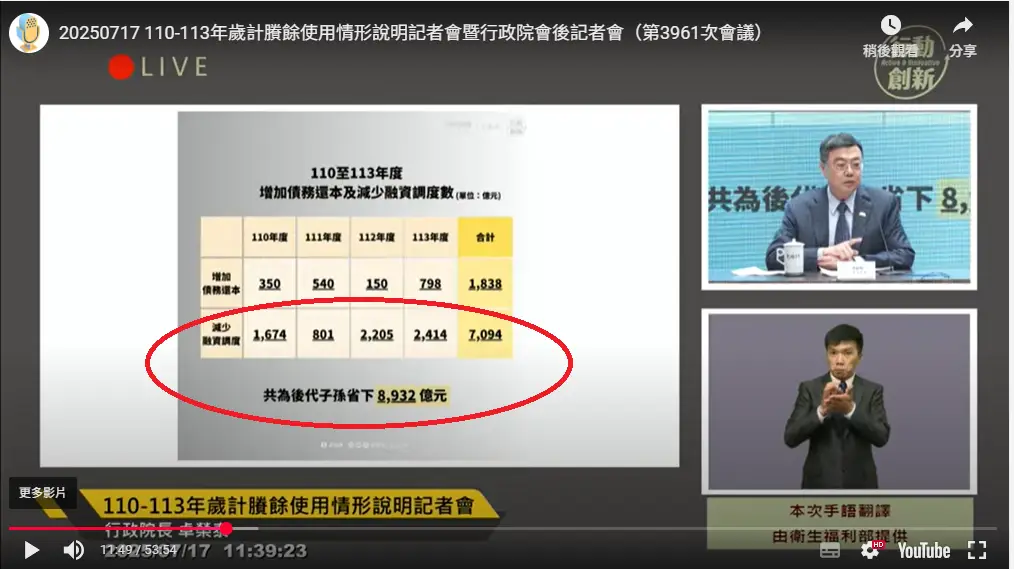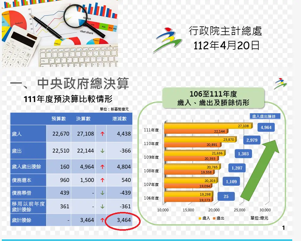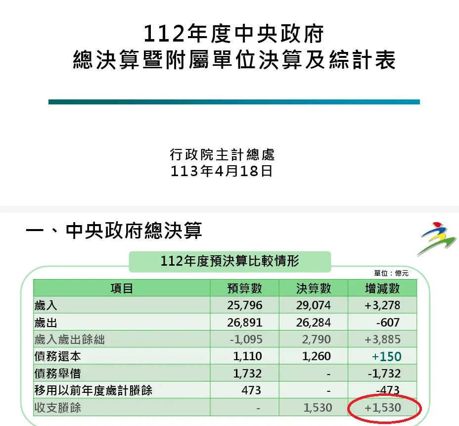 : 當中列舉了中央政府110-113年歲入歲出依據及最後剩下來的錢