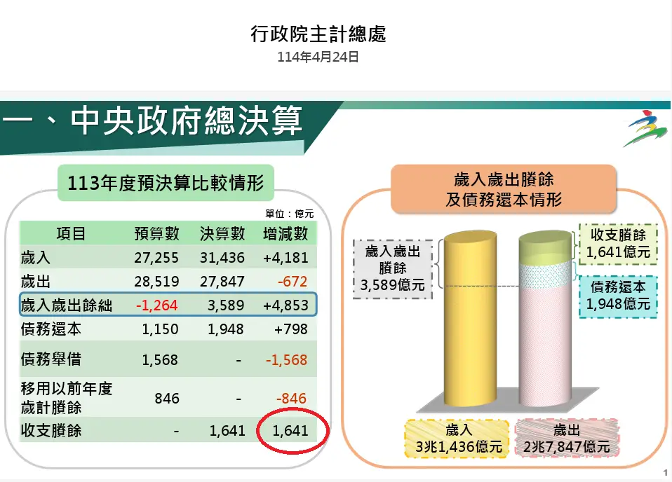 : 113年度:賸餘1,641億