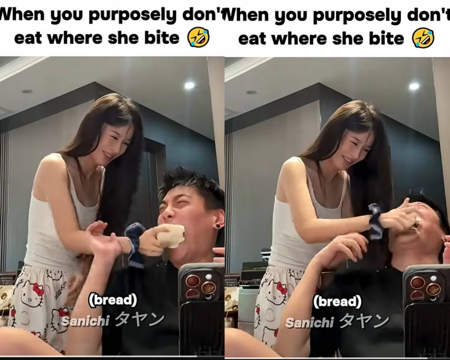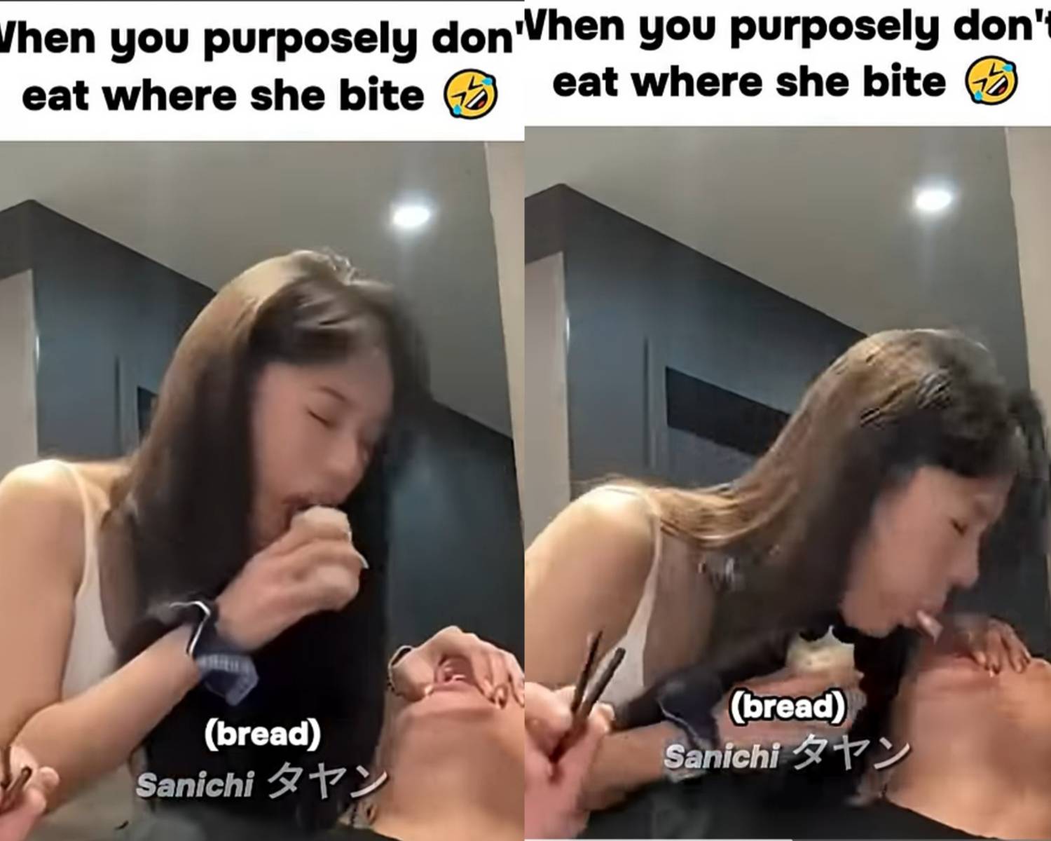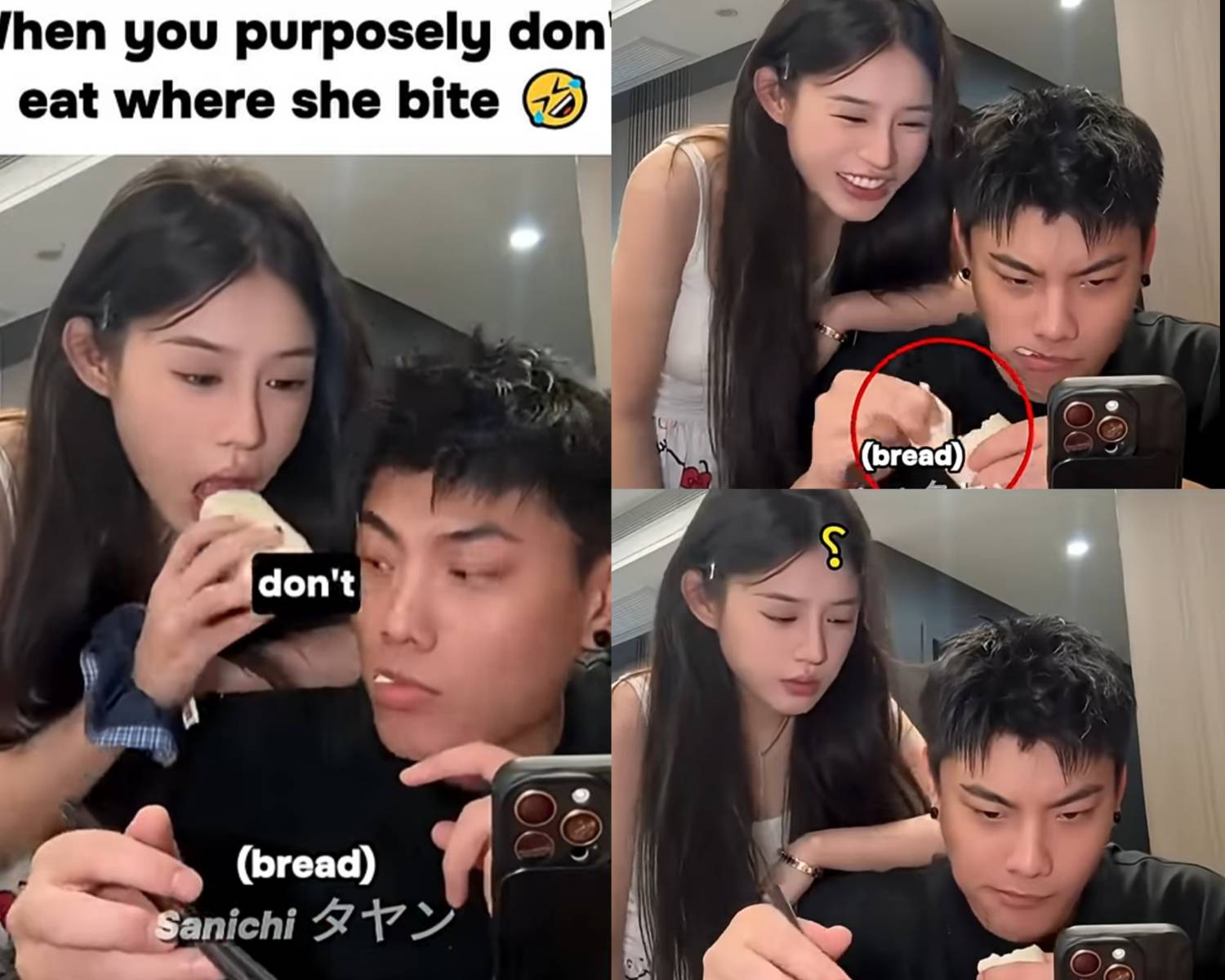 : 女友走過去說她也要吃,搶過麵包就直接咬一口,再遞回去男友手上