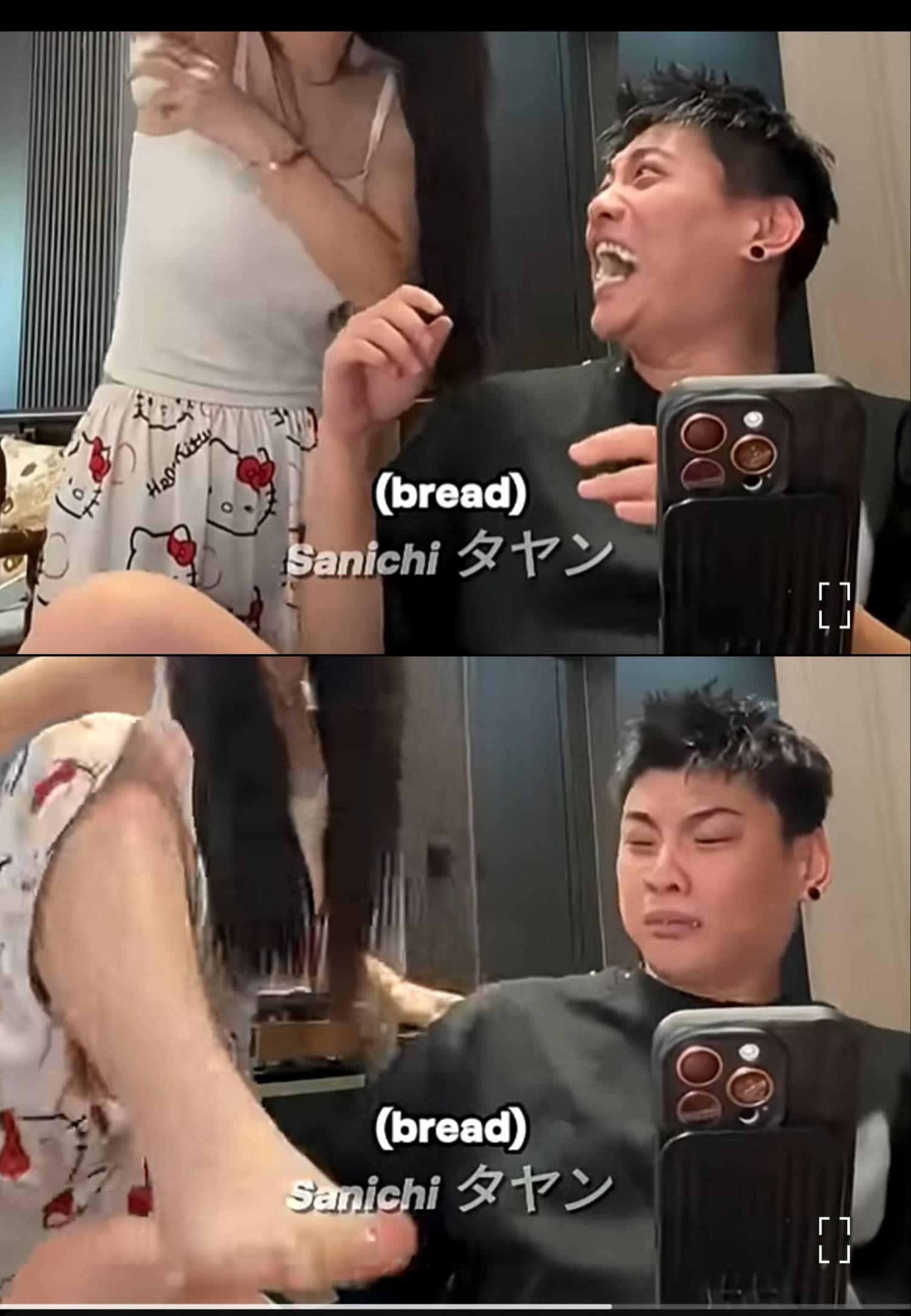 : 又搶過麵包,咬一口後抓住男友的臉,嘴對嘴直接吐進男友嘴巴