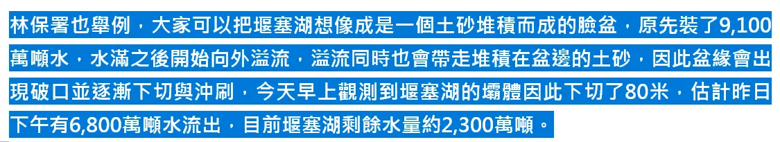 [討論] 如果當初學中國炸偃塞湖會多可怕看了一下 原來昨天只是溢流1/6 就已經大洪水了 如果真的跟藍白吹一樣 把偃塞湖炸開10
