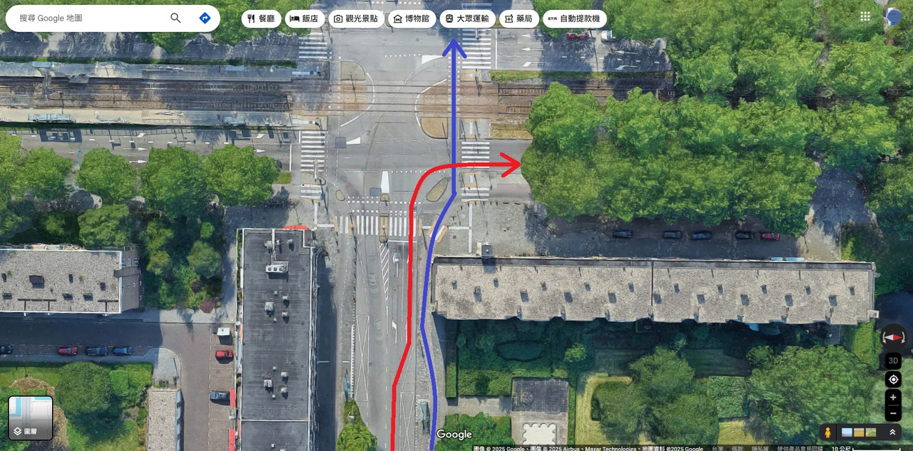 藍色是慢車道車輛動線、紅色是快車道車輛動線