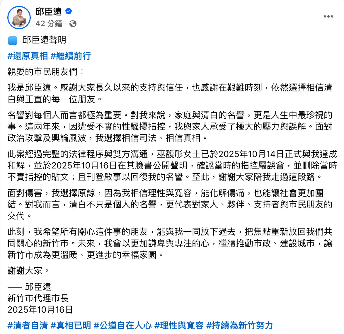 本人巫馥彤於民國112年6月17日及112年6月19日,在個人臉書刊載有關對於邱臣遠先生之指控,造成邱臣遠先生名譽受損,經雙方溝通後,同意上開指控內容實屬誤會,並於114年 10月14日達成和解,由本人於114年10月17日前刪除上開臉書貼文 ,並在本人臉書網頁連續刊載本聲明啟事至116年12 月31日止,以回復邱臣遠先生名譽。