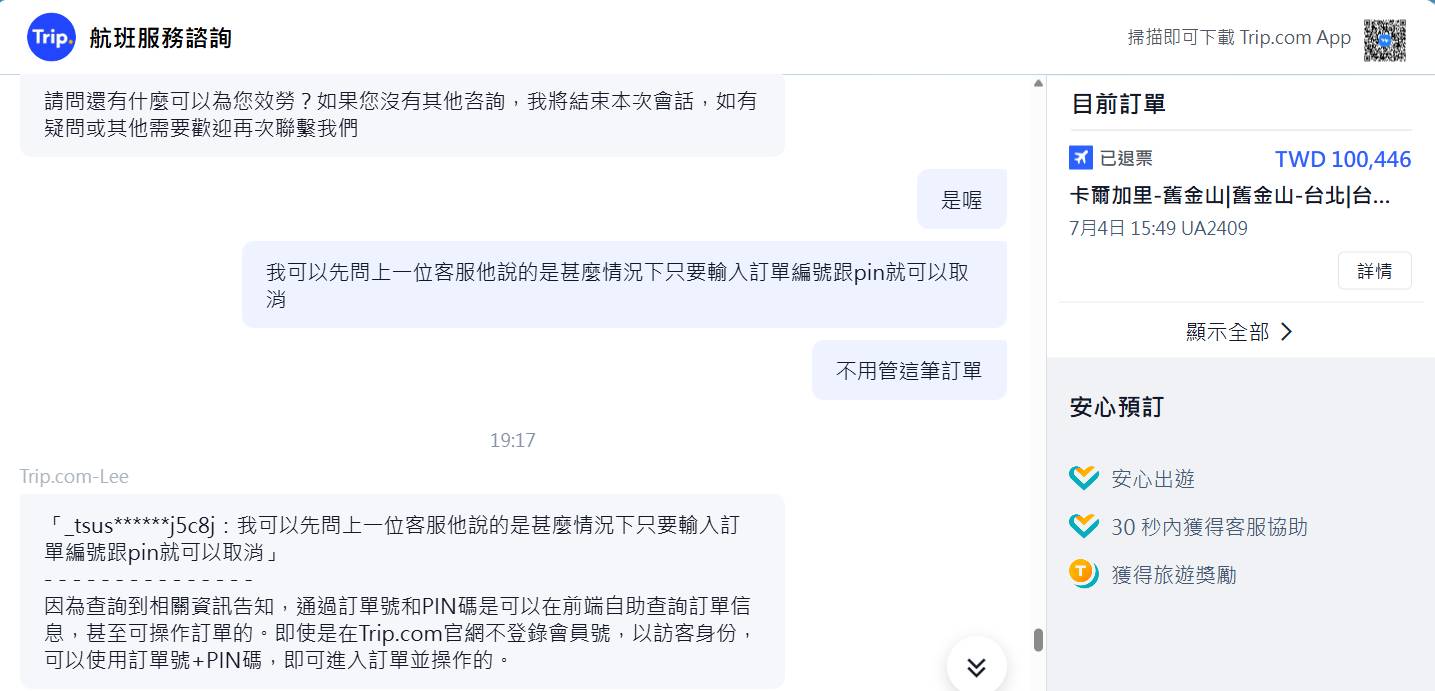 [討論] Trip官方客服:只有訂單和Pin無法退機票有人特別跑去問Tirp.com官方客服了 Trip.com的客服回覆 只有訂單編號和Pin碼是無法取消機票的唷 單選題,以下何者為誤![[討論] Trip官方客服:只有訂單和Pin無法退機票 [討論] Trip官方客服:只有訂單和Pin無法退機票](https://i.imgur.com/IbFiOZob.jpeg)