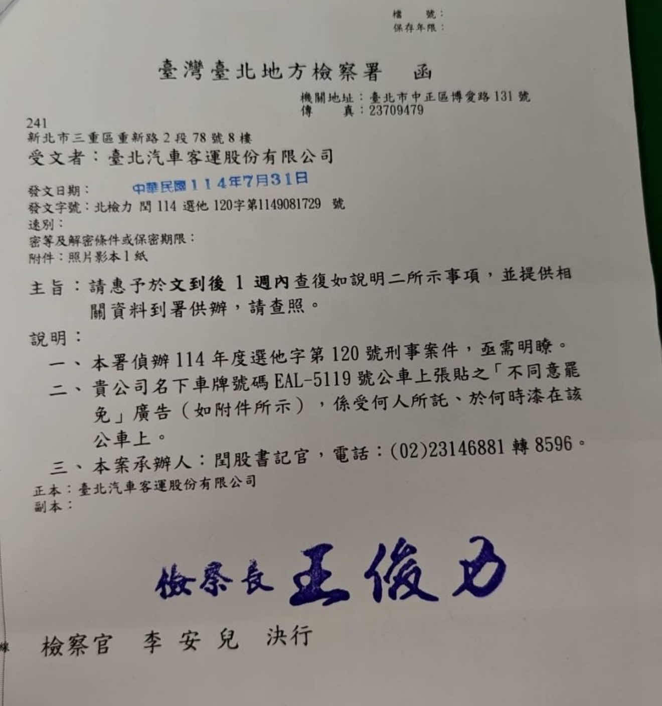 有人委託公車業者在車身張貼不同意罷免廣告,結果業者之後收到北檢函文,表示正在辦他字第刑事案件,要求業者提供委託者、何時張貼。