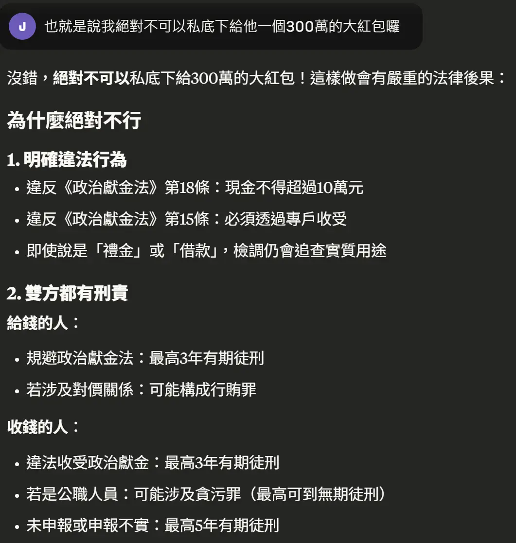 你的問題: 1.檢察官從頭到尾就沒起訴這筆,因為理論上沒有違法。 2.當「沒有道德」變成常態,自然也就沒有道德問題了。 想想真是諷刺。 那個曾經打著「白色清廉」、以「藍綠都是垃圾」自居、號稱要用最高標準進政壇的人,1