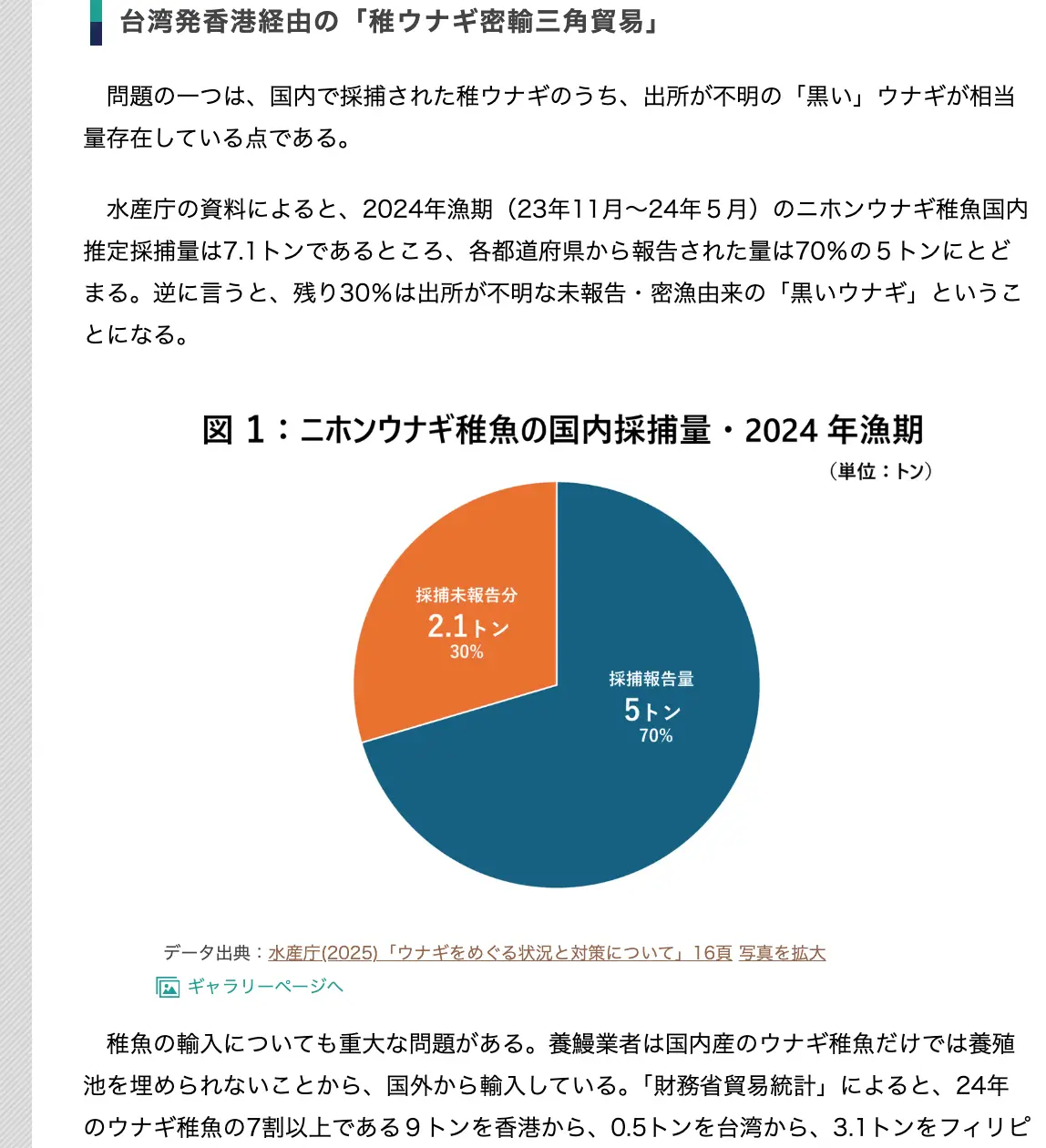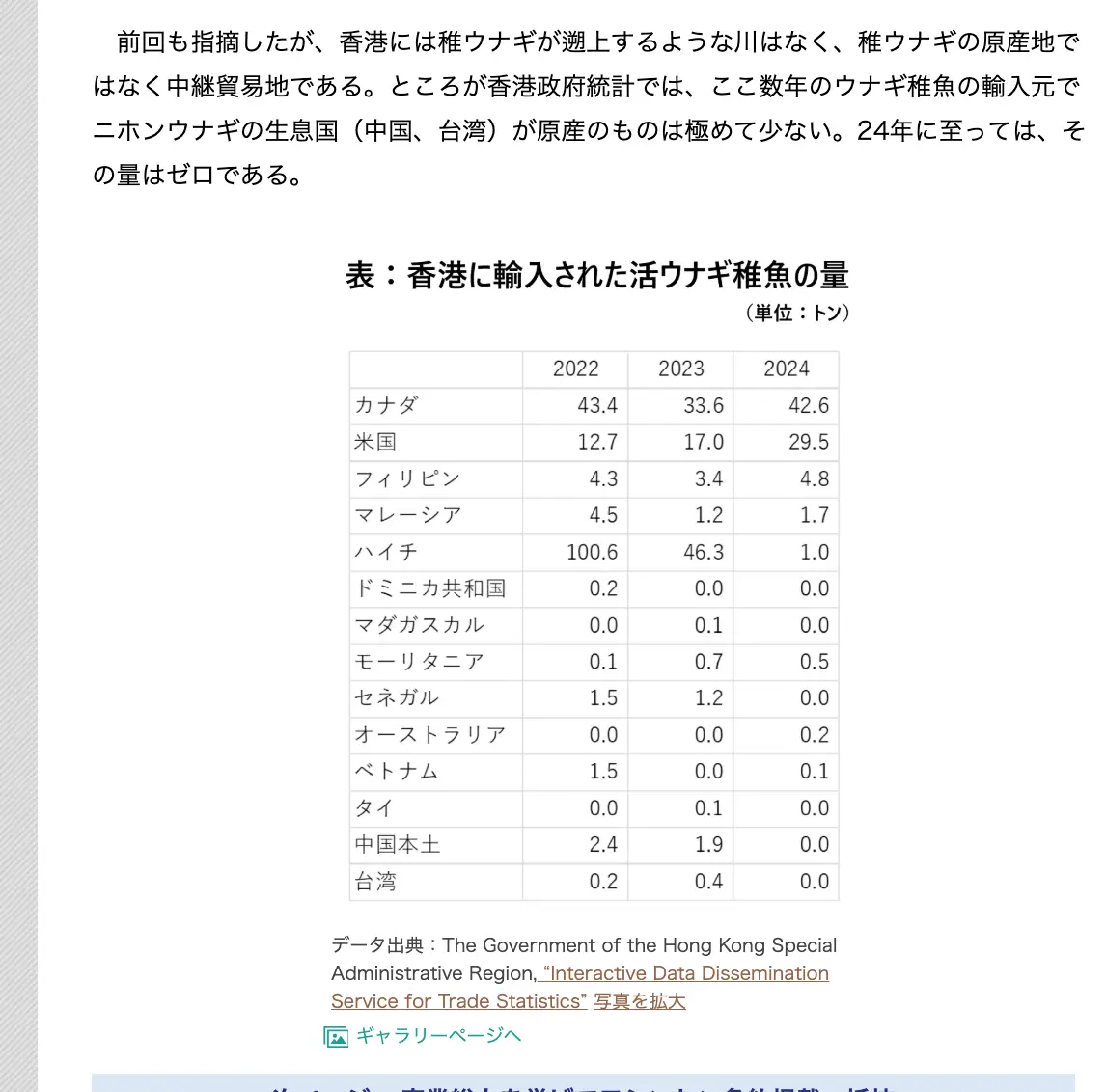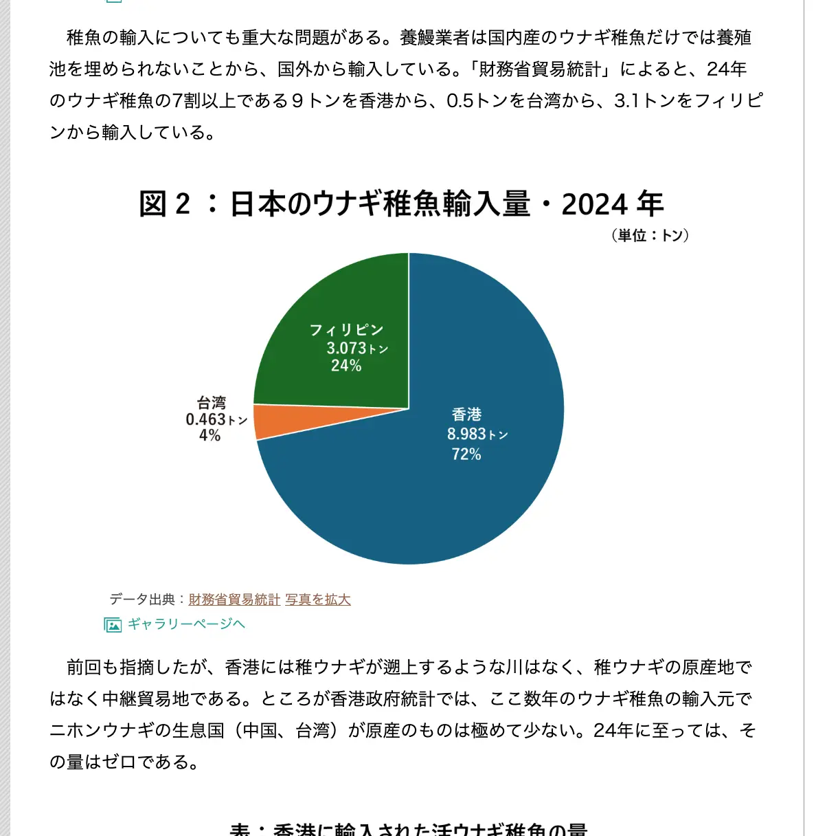 「…香港政府統計では、ここ数年のウナギ稚魚の輸入元でニホンウナギの生息国(中国、台湾)が原産のものは極めて少ない。24年に至っては、その量はゼロである。」