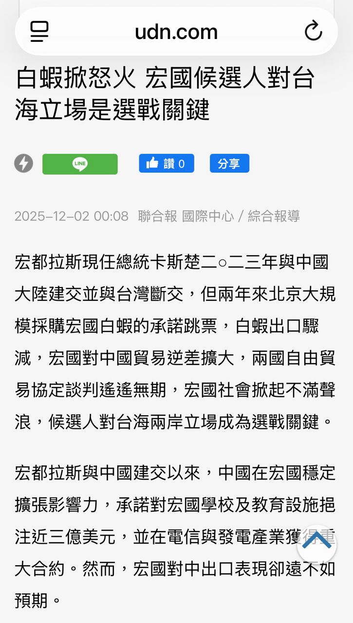 [問卦]看到斷交國蝦蝦賣不出去有多爽?宏都拉斯2023/3/26斷交,至今已超過一年 我看新聞一直說,宏都蝦農一直哭哭白蝦賣不出去 但是斷交後,好像還是一直賣到台灣阿 你各位猜猜,加了關稅之後變貴的白蝦是誰掏更多錢買? 中國建交完爽約? 台灣仍穩居宏都拉斯白蝦第一大出口國![[問卦]看到斷交國蝦蝦賣不出去有多爽? [問卦]看到斷交國蝦蝦賣不出去有多爽?](https://img.ltn.com.tw/Upload/news/600/2023/04/08/122.jpg)