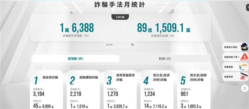 : 根據「165打詐儀錶板」最新資料顯示,今年6月全臺詐騙造成的財物損失高達89億1509: .1 萬元。其中,高財損詐騙手法以假投資詐騙最多,而假交友投資詐騙,以及假檢警詐: 騙等手法仍是常見的詐騙伎倆。