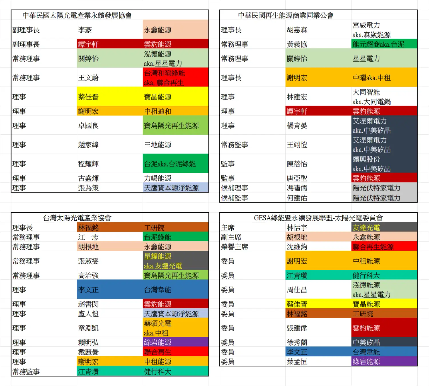 中華民國太陽光電發電系統商業同業公會、中華民國太陽光電產業永續發展協會、台灣太陽光電產業協會、中華民國再生能源商業同業公會、GESA綠能暨永續發展聯盟-太陽光電委員會、中華民國商業總會能源產業推動委員會、太陽光電暨儲能品質安全協會等七大太陽光電產業公協會