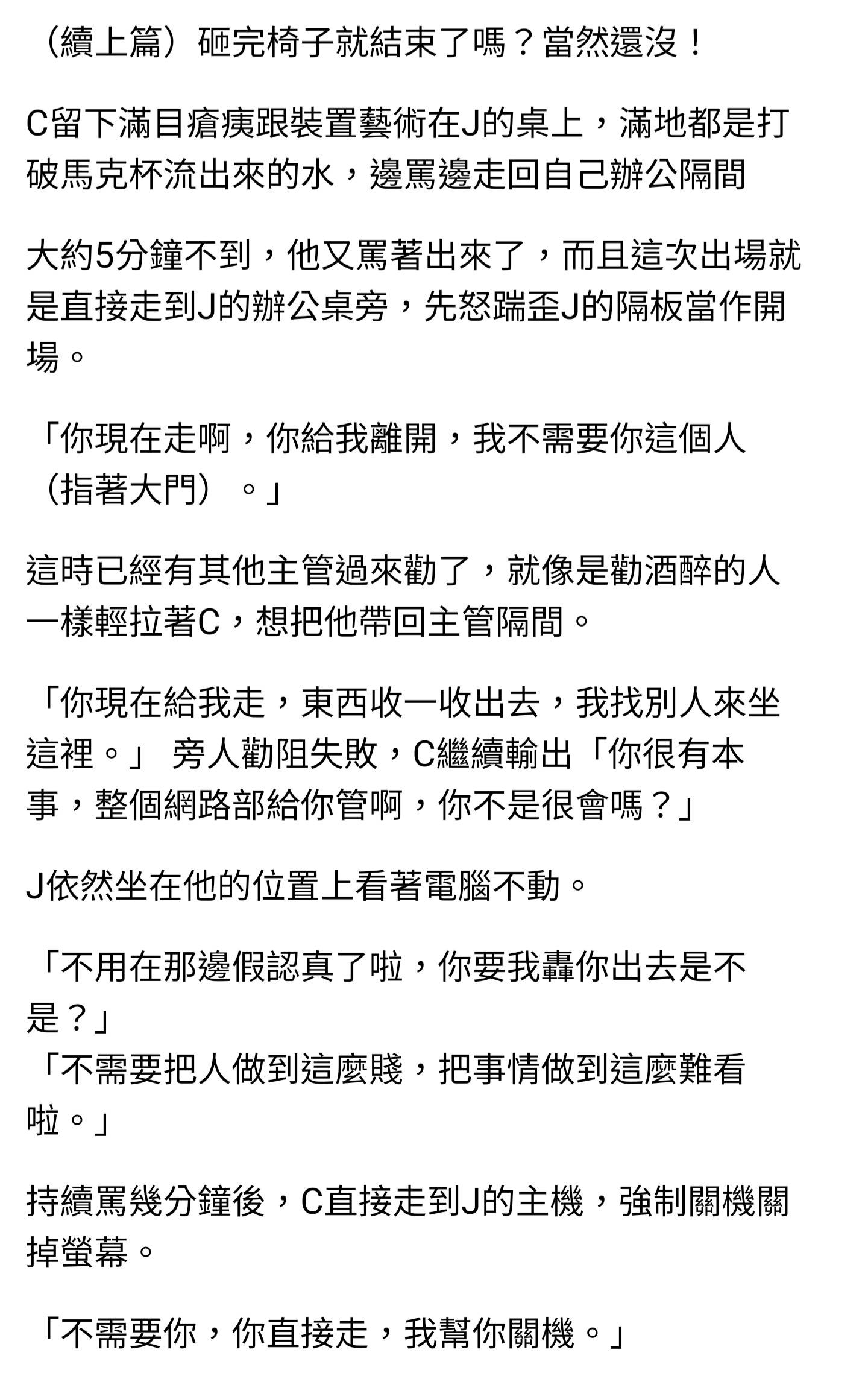 「你現在給我走,東西收一收出去,我找別人來坐這裡。」 旁人勸阻失敗,C繼續輸出「你很有本事,整個網路部給你管啊,你不是很會嗎?」