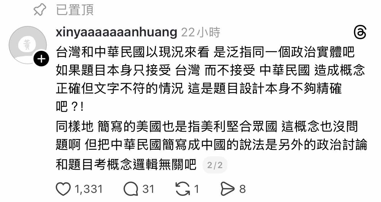 題目本身在搞台獨,有什麼資格說別人錯
