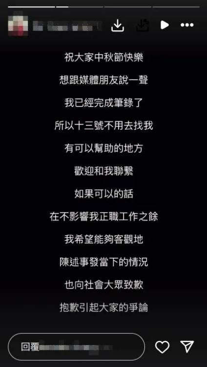 : 「飛踢哥」昨日在IG限時動態祝大家中秋節快樂,並向媒體朋友告知一聲:「我已經完成: 筆錄了,所以13號不用去找我,有可以幫助的地方,歡迎和我聯繫,如果可以的話,在不: 影響我正職工作之餘,我希望能夠客觀地,陳述事發當下的情況,也向社會大眾致歉,抱: 歉引起大家的爭論。」