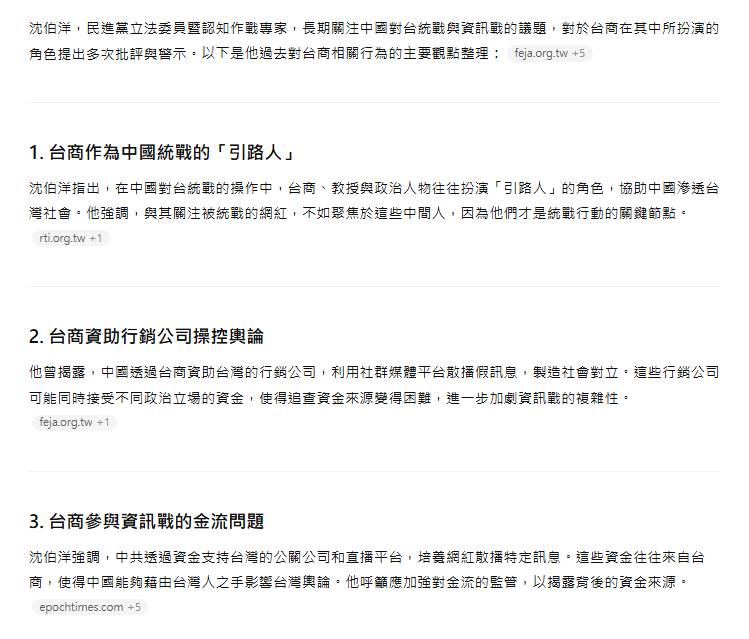 總結而言,沈伯洋認為台商在中國對台統戰與資訊戰中扮演關鍵角色,應加強監管與立法,以防止其成為影響台灣社會穩定的中間人。