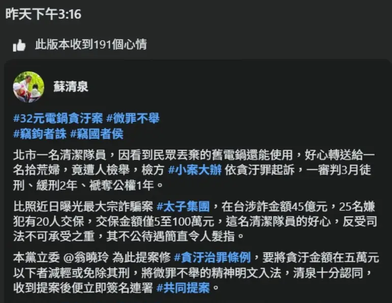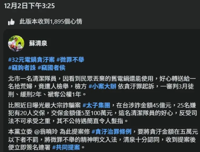 [討論] 32元貪污案件 一審宣判出爐大家記得有一位清潔員 「32元」電鍋的案件嗎?(被起訴貪污罪) 士林地方法院今天上午一審宣判:有罪 有期徒刑3月、緩刑2年、褫奪公權1年 法務部今天上午回應:![[討論] 32元貪污案件 一審宣判出爐 [討論] 32元貪污案件 一審宣判出爐](https://i.imgur.com/27qFlcJb.jpeg)
