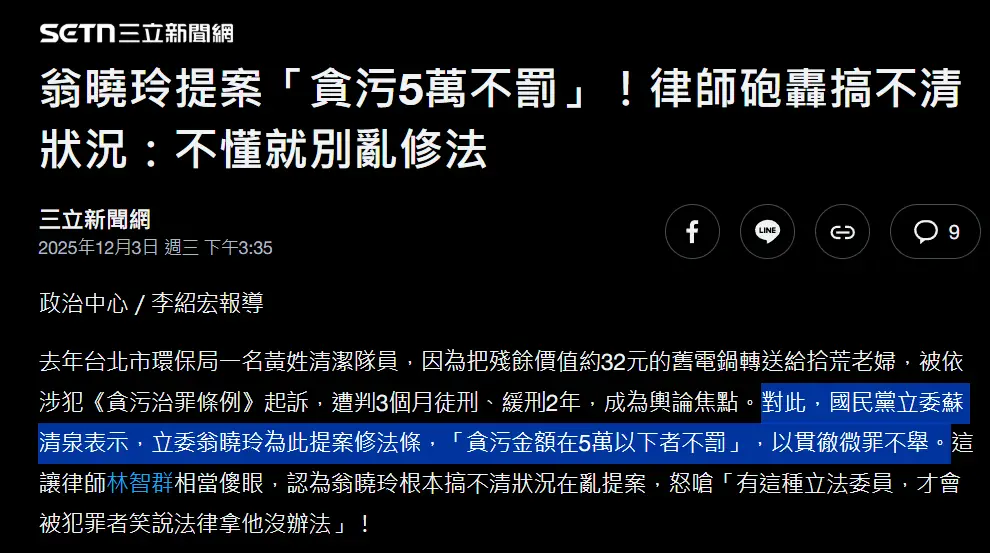 那就是綠媒指稱「翁曉玲提案貪污以下五萬免罰」