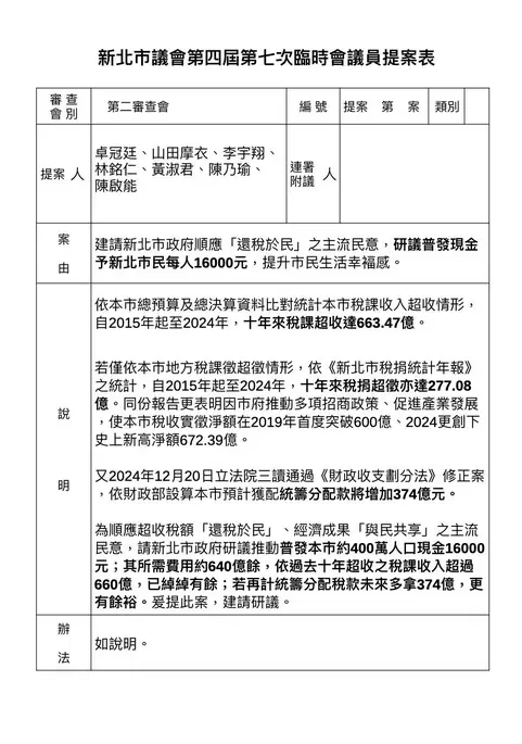 [討論] 新北議員七人提案新北市政府普發16000元