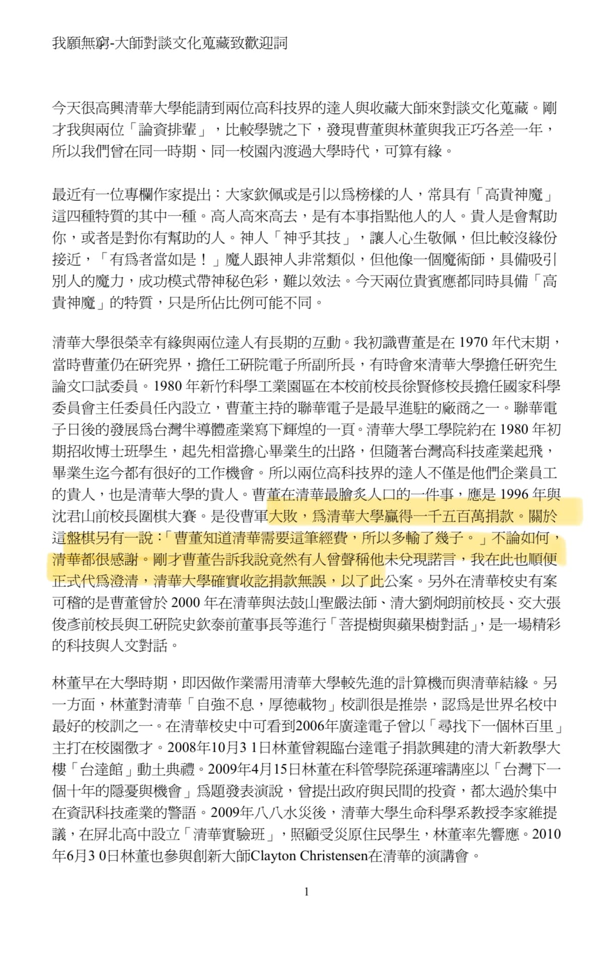 : 此演講稿中曾提到,曹興誠在1996年與沈君山前校長進行圍棋大賽,為清大贏得1500萬元捐