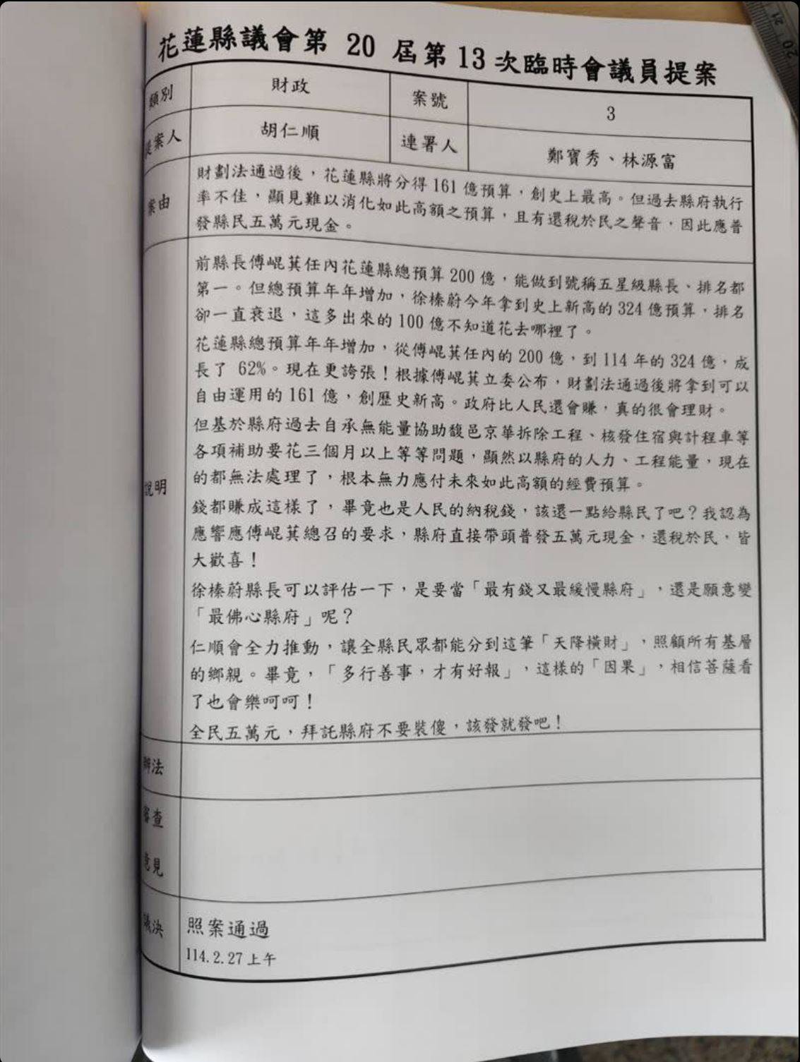 地方發4萬五萬那就是議會通過的決議,地方