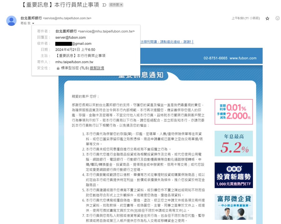 : 我今天大早就收到富邦銀行發給客戶的緊急通知,