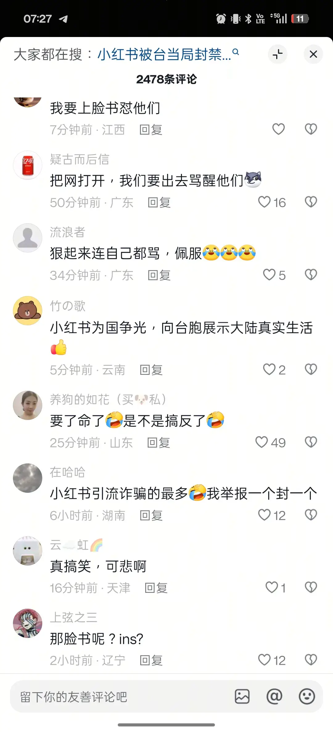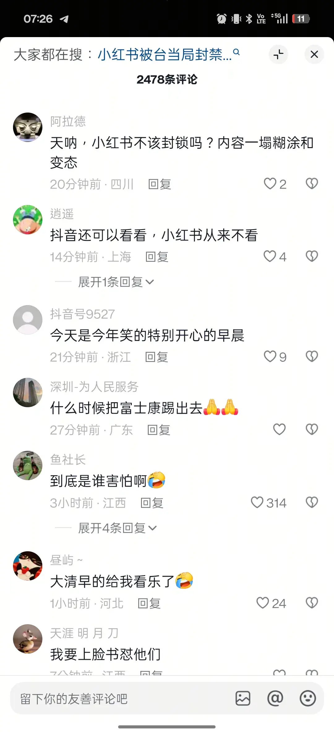 繼續你的表演 真要共 第一個封抖音 封什麼小紅書 這就是鬧不起來的原因 抖音好好的 在那邊喊綠共 不要笑死我
