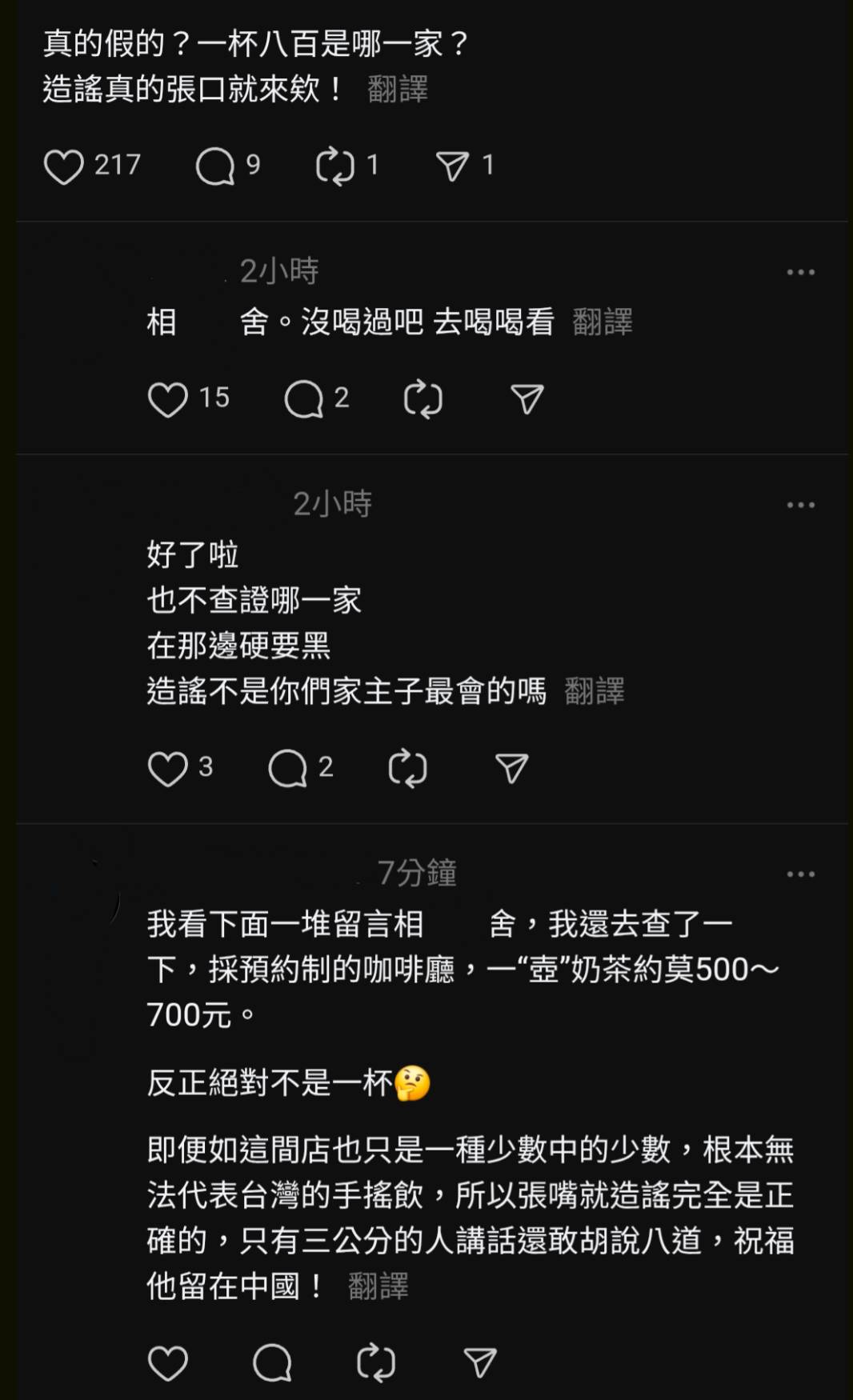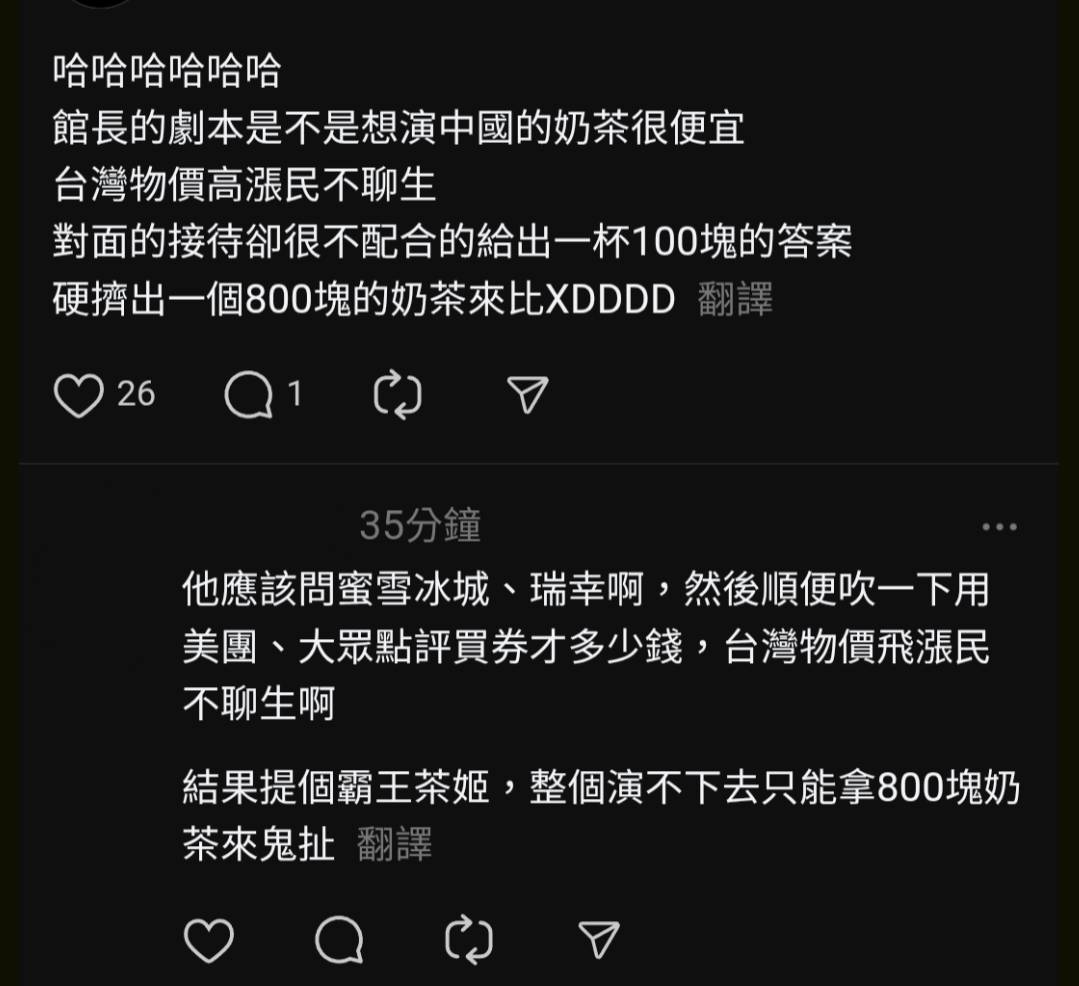 知名台灣時政網紅館長(政黑點),昨晚台灣奶茶賣台幣八百元,折合人民幣兩百元