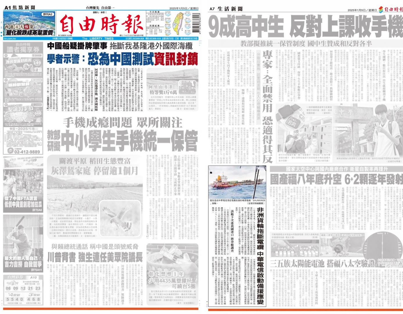 自由時報用頭版頭、A7版左下大篇幅報導。