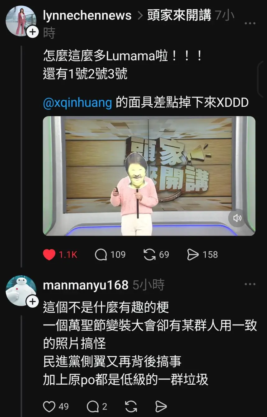 [討論] 歷史哥跟900如何評論台大學生扮演盧媽?台大萬聖節活動 集體扮演盧媽媽拍鼓 藍營網紅歷史哥說這是敗票行為 已經32:0明年會22:0![[討論] 歷史哥跟900如何評論台大學生扮演盧媽? [討論] 歷史哥跟900如何評論台大學生扮演盧媽?](https://i.imgur.com/feqoR54b.jpeg)