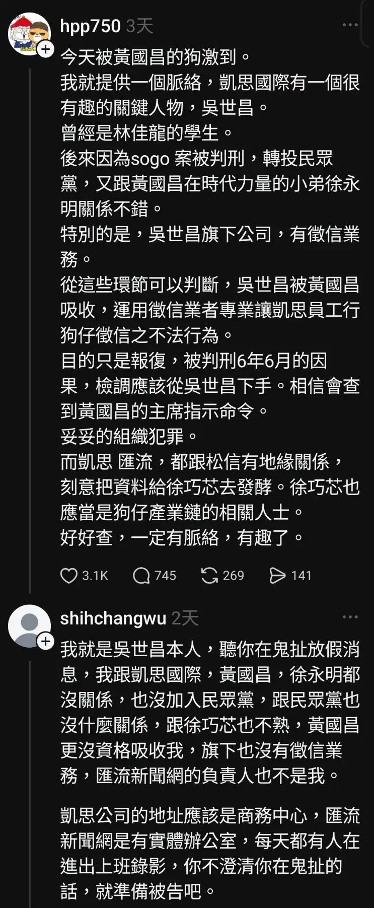 然後吳世昌本人目前則是提告張姓網友、陳凝觀、安幼琪跟吳靜宜