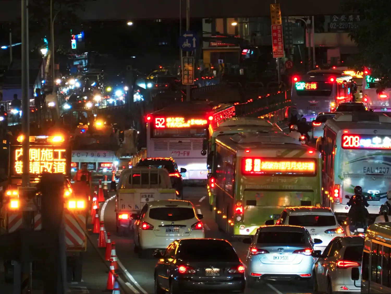 拍攝於18:47,算是過了尖峰時刻,有確認已經是綠燈,公車塞滿三個車道